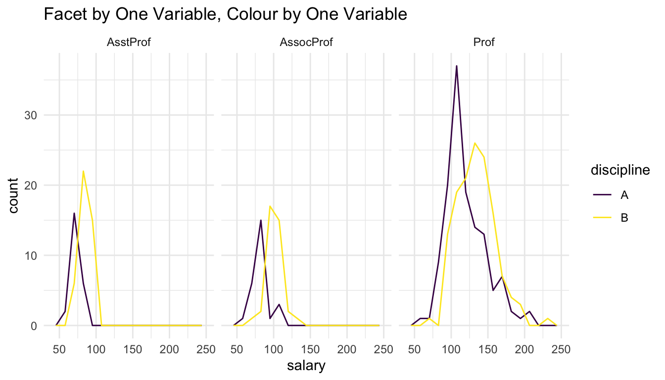 labs(title = "Facet by One Variable, Colour by One Variable")