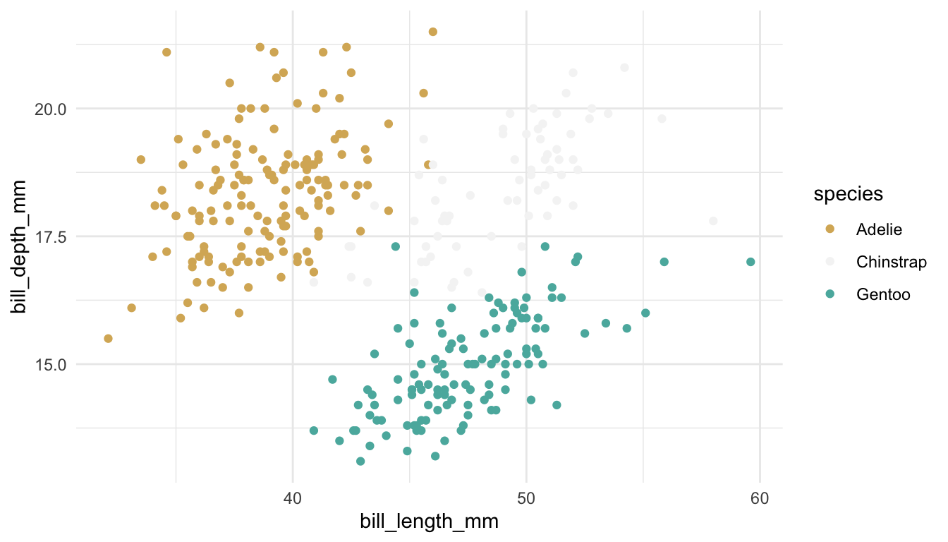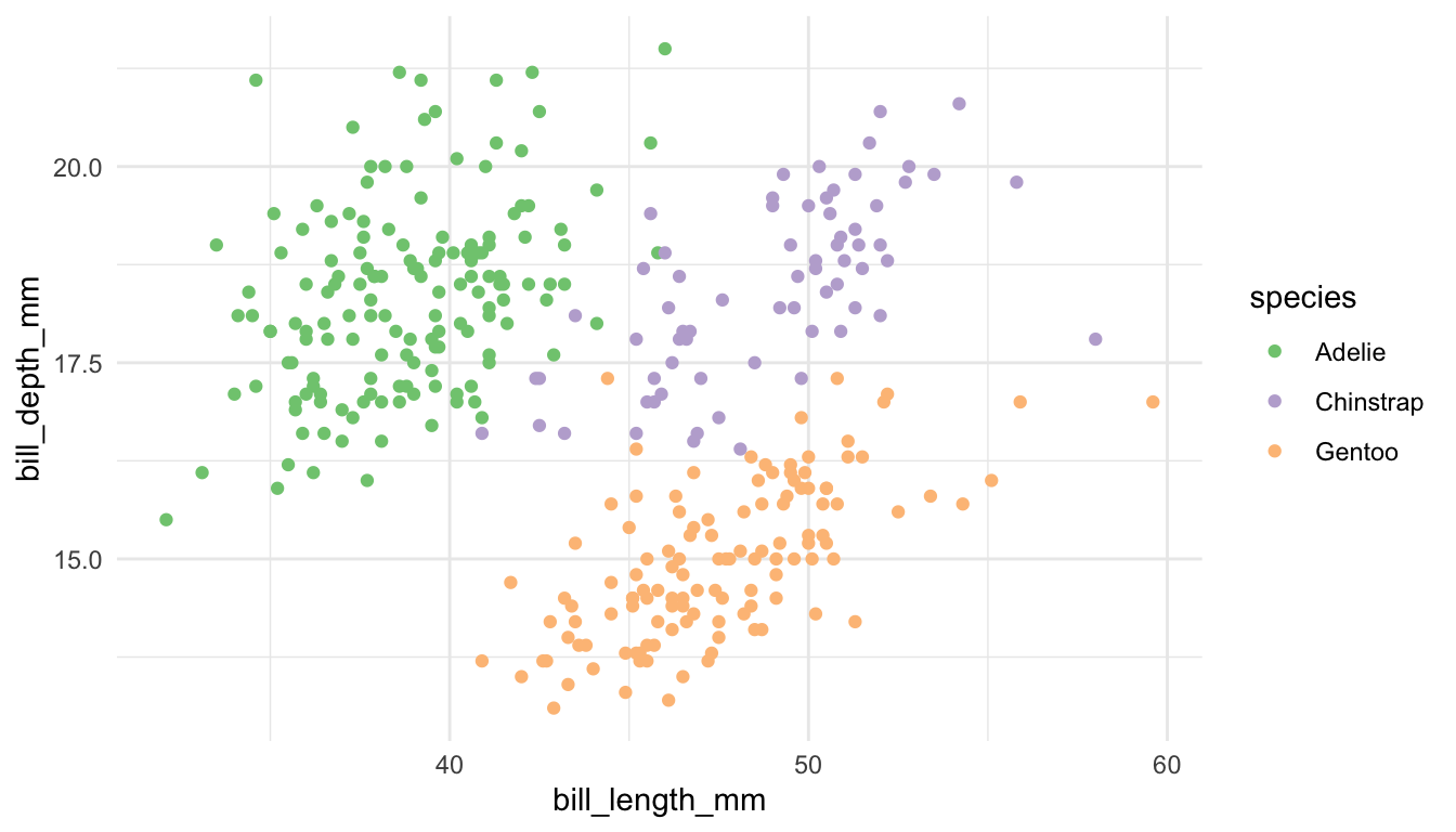 We will use the penguins data set from the palmerpenguins package. Each row corresponds to a particular penguin. Categorical variables measured on each penguin include species, island, sex, and year. Quantitative variables include bill_length_mm, bill_depth_mm, and body_mass_g.