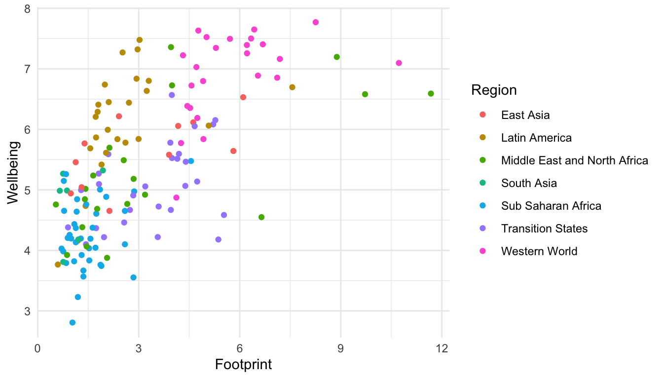 ggplot(data =hpi_df, aes(x =Footprint, y =Wellbeing, colour =Region))+geom_point()
