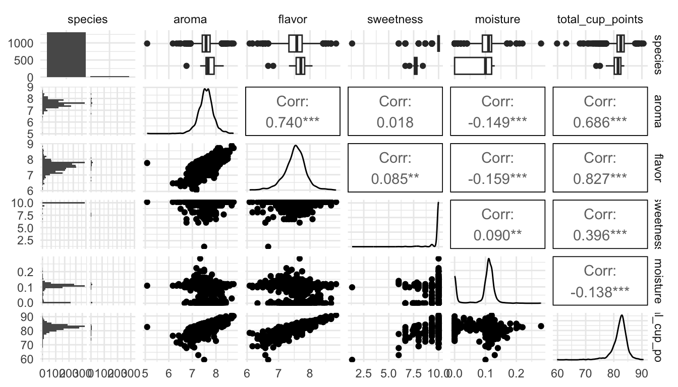 ggpairs(coffee_df, columns = c("species", "aroma", "flavor", "sweetness",