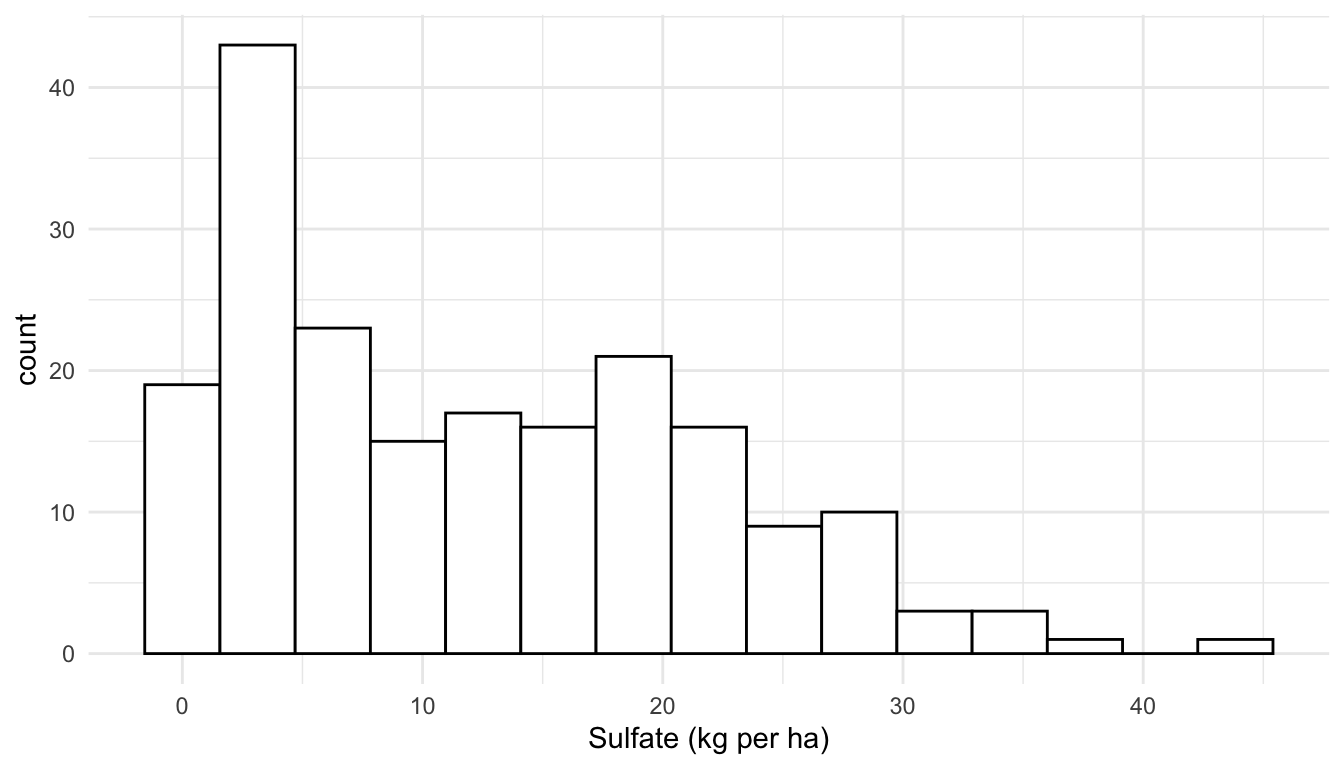 Because of the squared difference term in the numerator of Equation 1.1, the calculation of the empirical semivariance is sensitive to large outliers. Therefore, in addition to a spatial map of a variable and an empirical semivariogram, exploration of the response variable with a standard histogram (or other graph for exploring a single quantitative variable) is useful. In general, for sf objects, we can use geoms like geom_histogram() in the same way that we use them for data.frame objects and/or tibbles: