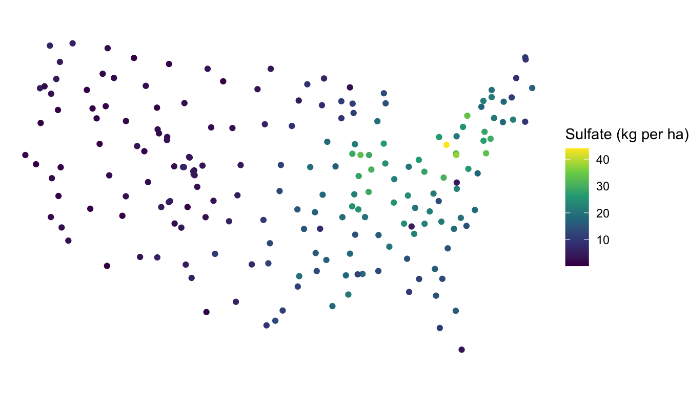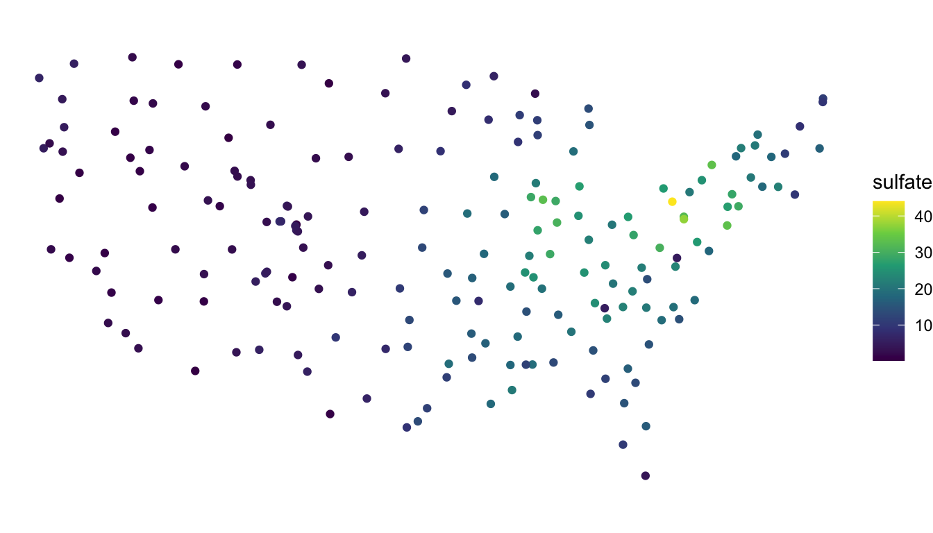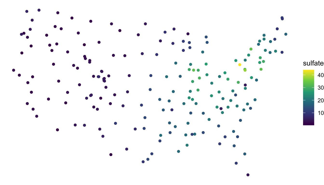 Note that, because sulfate is an sf object, we do not need to specify x and y coordinates for our plot: these are pulled automatically from the geometry of sulfate when we use the geom_sf() function designed specifically for sf data objects.