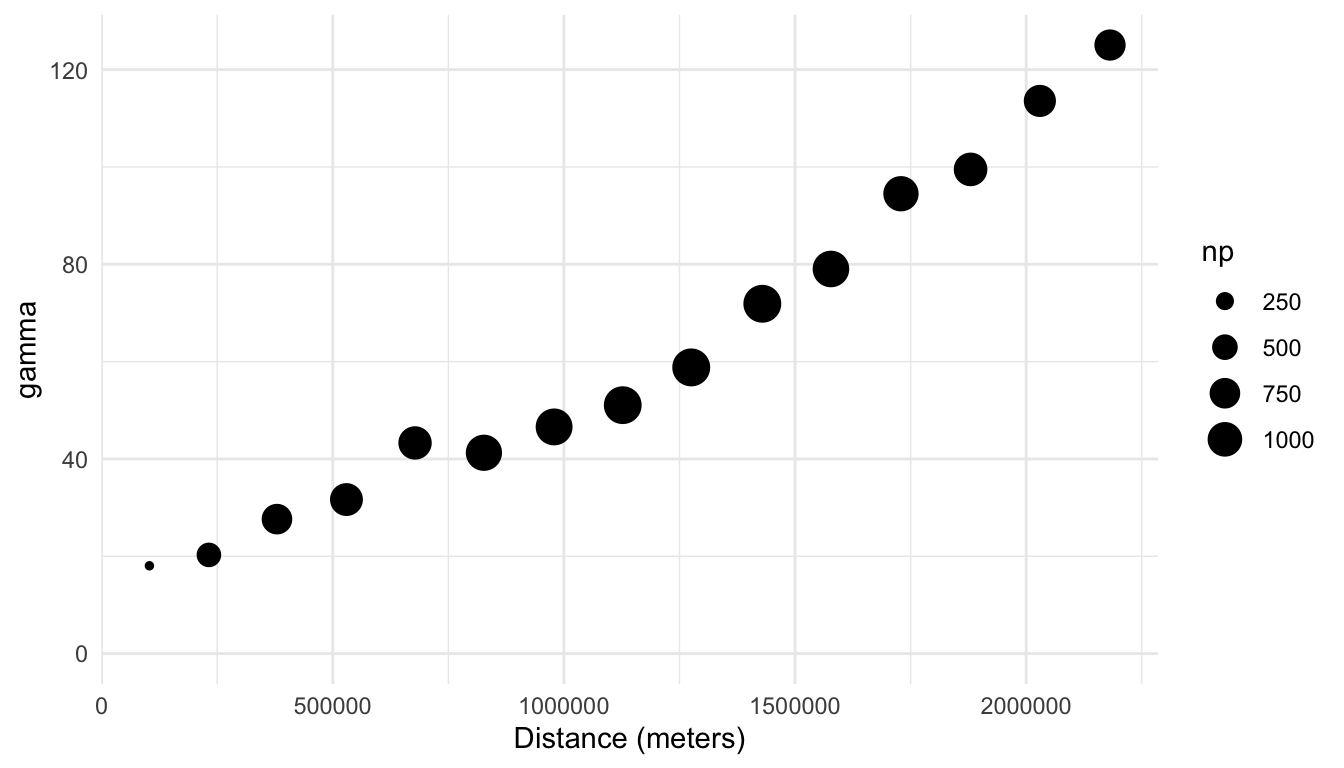 bins, a variable that gives the bins. By default, the bins are all of equal width (as are the bins in a standard histogram of a quantitative variable).distis the average distance, in meters, of all of the pairs that fall within the bin.gammais the value of the semivariance, \(\gamma(h)\), according to Equation 1.1.npis the number of points, \(\vert N(h) \vert\) from Equation 1.1.
