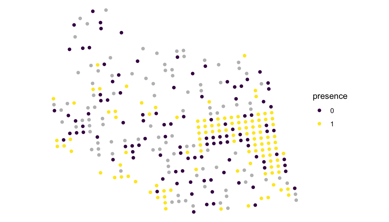 We see from this plot that there are slightly more locations with moose present than there are with moose absent. And, there appears to be some evidence of spatial correlation: locations that are near each other in space seem to be more similar than locations that are further apart. We also clearly see that the sampled locations were not randomly selected, as there are a lot of locations in the eastern part of the plot. Recall from Chapter 4 that random selection of sites is not a strict assumption for the spatial model. If wildlife managers are most interested in the eastern region of the study area, it is perfectly reasonable to concentrate more samples in that region.