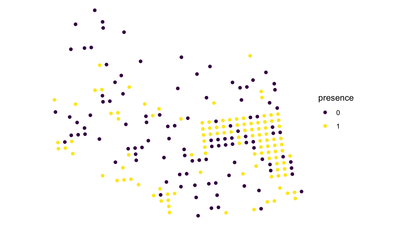 ## 10 430.5000 L 0 0 POINT (321354.6 1509966)Our goal is to construct a spatial model for moose presence, perhaps using elev and strat as predictors in the model. Note that, because presence is binary (moose are either present or absent), a spatial model with normally distributed random errors is not appropriate. But, before we get into any modeling, we first construct a plot of the data:
