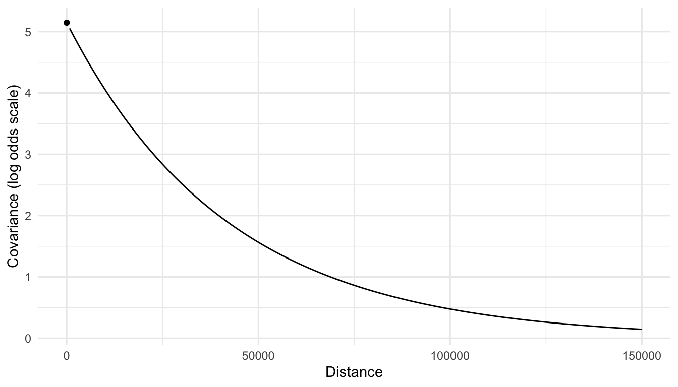 As we can see from the equation above, modeling the spatial covariance on the log odds scale makes interpretation of the estimated covariance parameters tougher. We can still construct a spatial covariance plot to assess how covariance decays with distance, but the raw values of covariance are a lot harder to understand: these are on the log-odds scale now, which is not as easy to think about as the response variable scale was in Chapter 3.