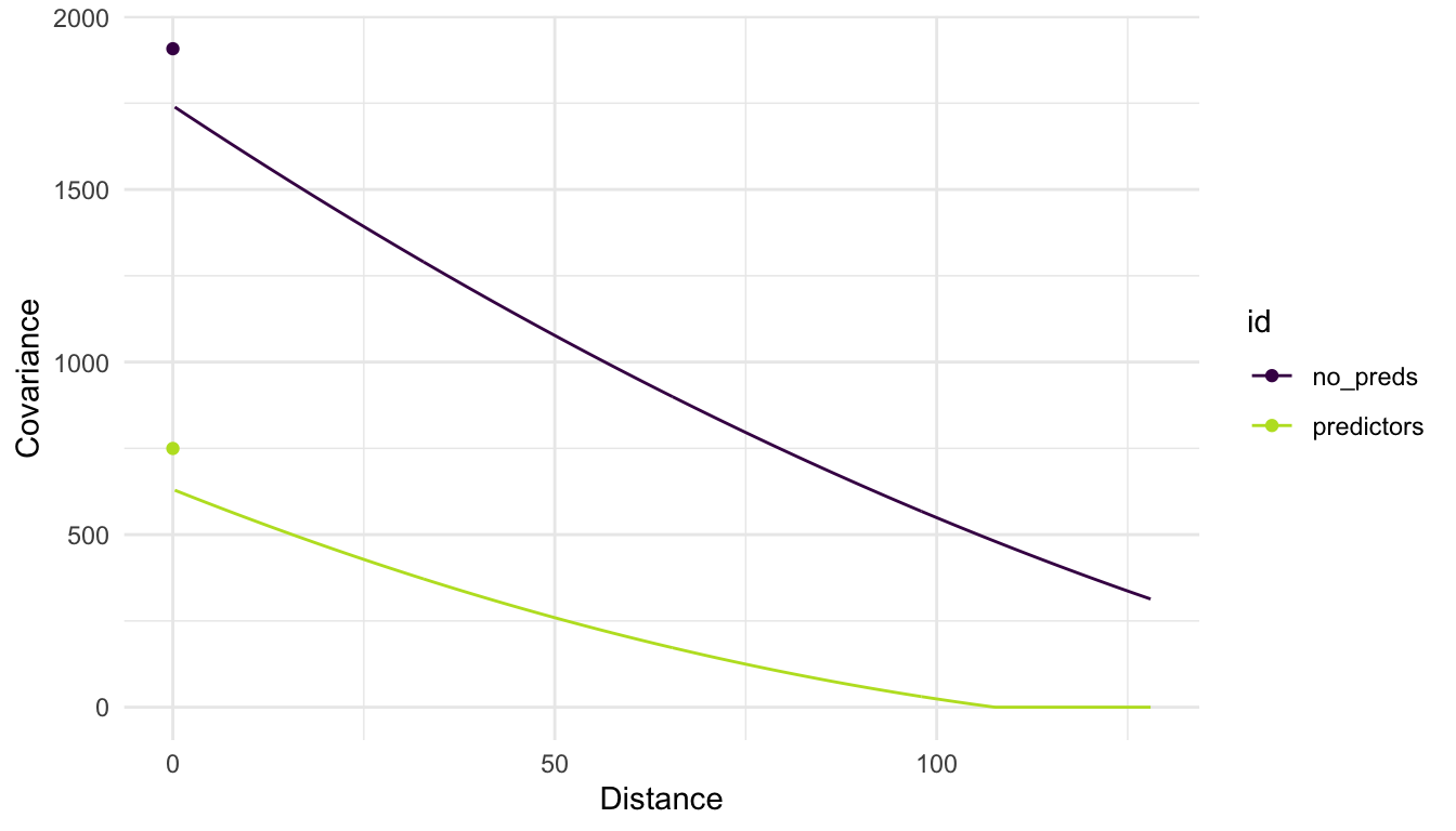 We see that there is a large amount of spatial covariance estimated. However, when we introduce predictors into our model, we model the random errors (\(\delta_i\)) with the chosen spatial covariance function. Doing so can drastically change the estimated covariance parameters: