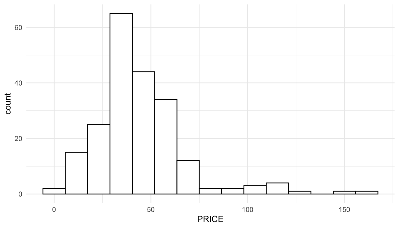 Note that if we construct a histogram of the response variable, PRICE, we observe some right-skewness.