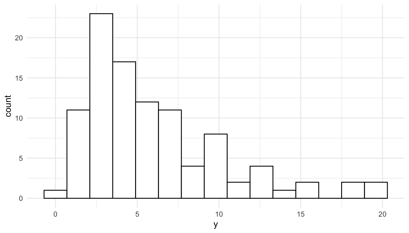 The reason that we can see skewness in the response variable but not in the residuals is that, for the histogram of the residuals, we are taking into account the effects of the predictors. A simple linear regression example can help illustrate this. In the toy example below, we see that the observed distribution of the toy response variable, \(y\), is clearly right-skewed.