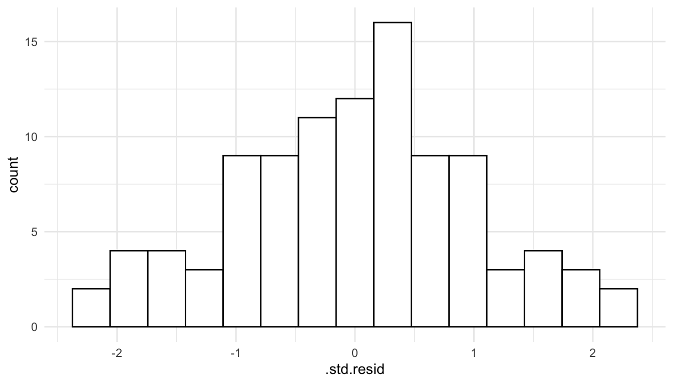 To assess this assumption, we can construct a histogram of the standardized residuals.