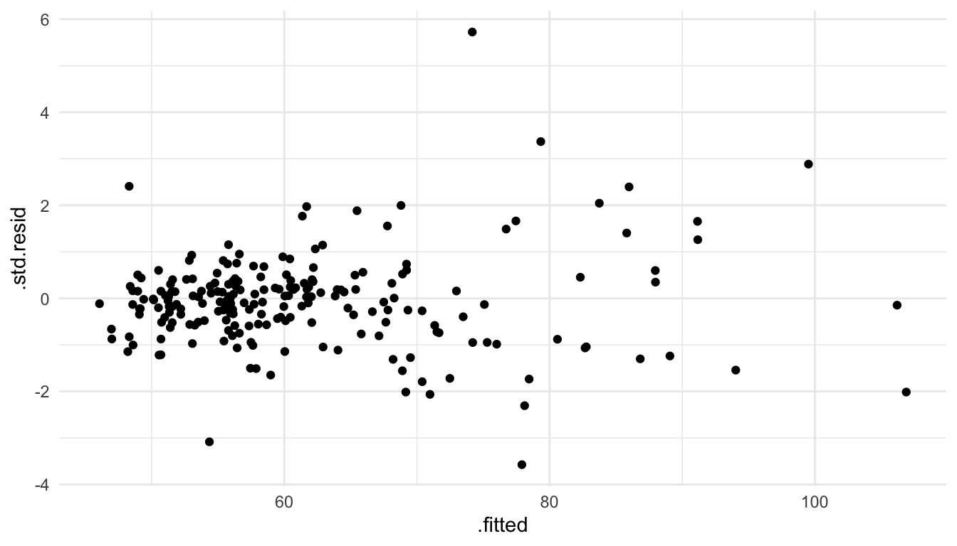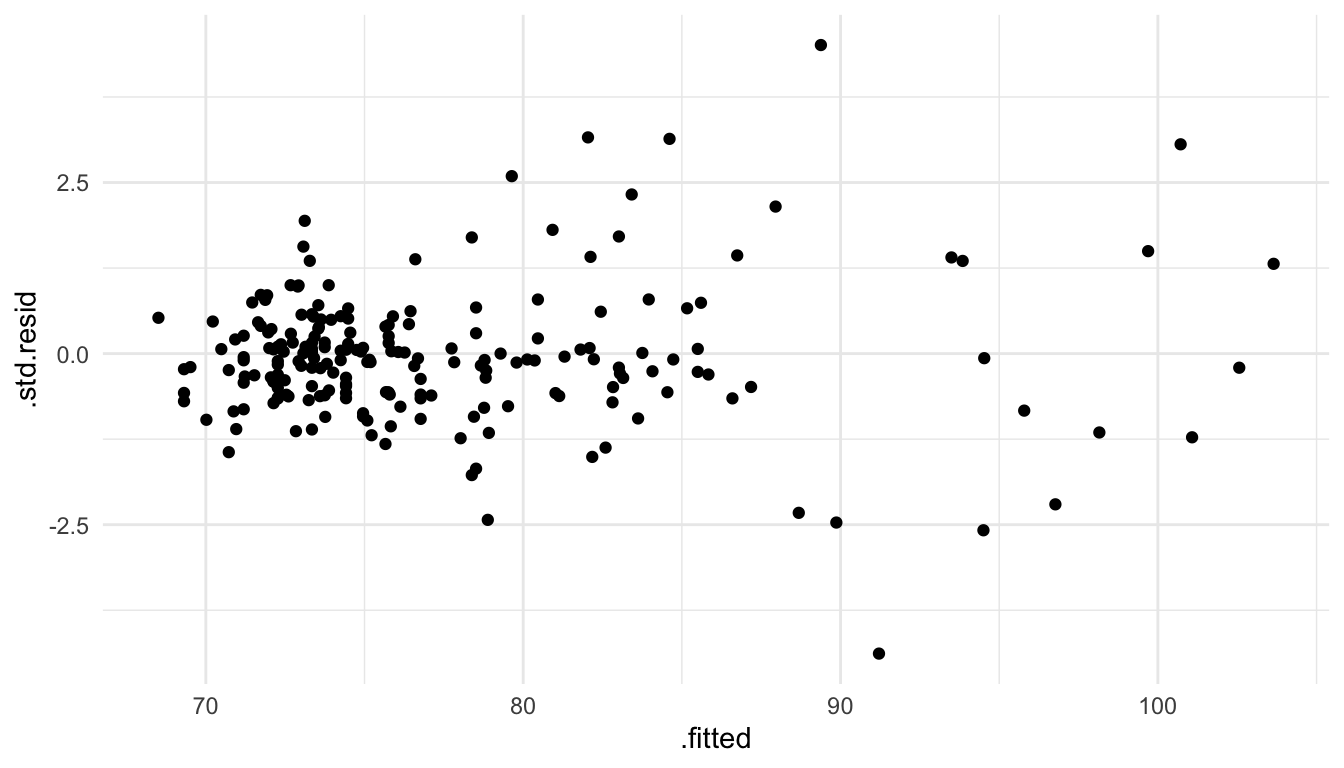 From this plot, we see that there is some mild evidence against this assumption. For predicted \(\hat{y}_i\) that are small, there is less overall variability in the standardized residuals. On the other hand, for large fitted values, there is a bit more overall variability in the standardized residuals. However, this is not a drastic pattern: some may look at this plot and say that the assumption of constant variance seems reasonable while others might not be satisfied with that particular assumption.
