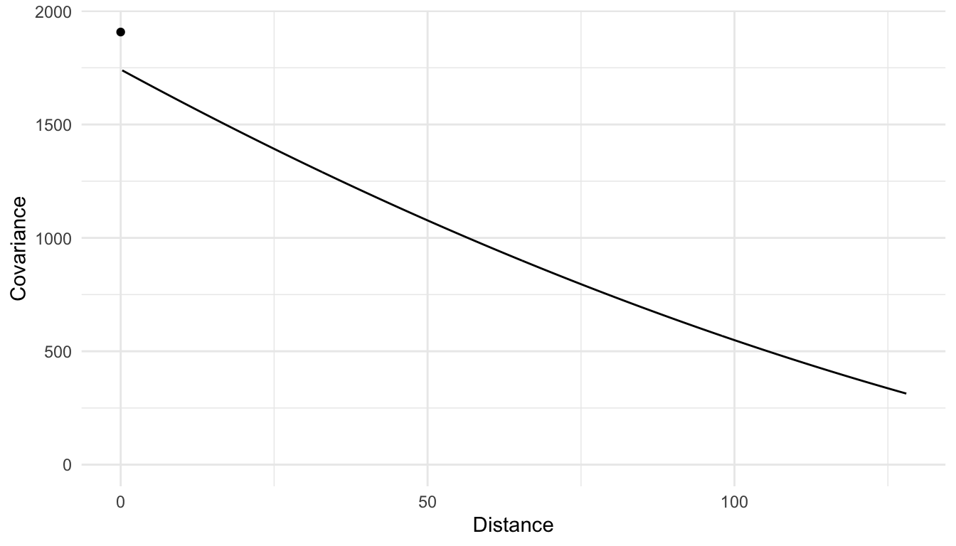We also assume that the covariance between \(\delta_i\) and \(\delta_j\) is a function of the distance between the locations \(i\) and \(j\) only. We can relax this assumption and assume that the covariance is a function of both distance and direction between the locations \(i\) and \(j\) by fitting an anisotropic model. However, in this section, we only consider isotropic models for which the covariance is only a function of distance.