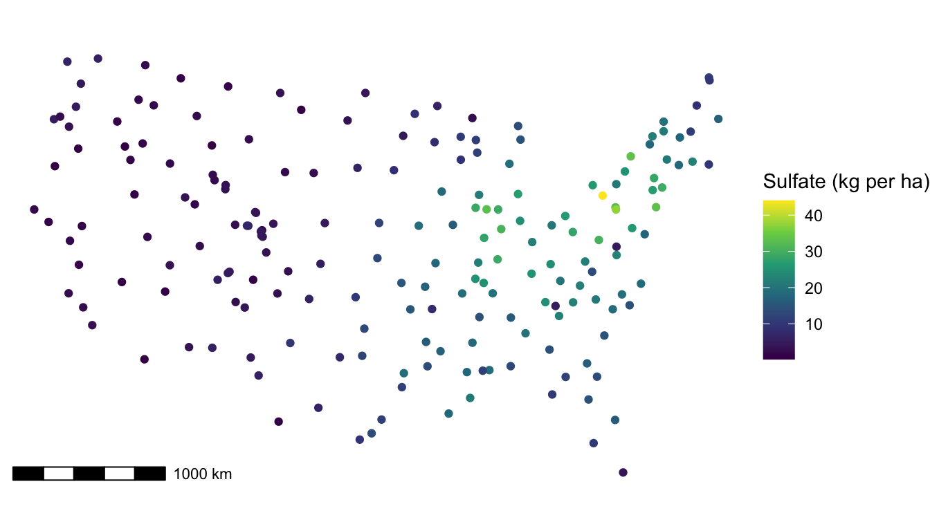 Now that we have some experience with more formal spatial modeling, we will go back and use sulfate data again to fit a formal spatial linear model. Recall that we had constructed a plot of the response variable, sulfate concentration, at the measured spatial locations (note that to recreate the plot, the ggspatial package is needed to reconstruct the scale bar):