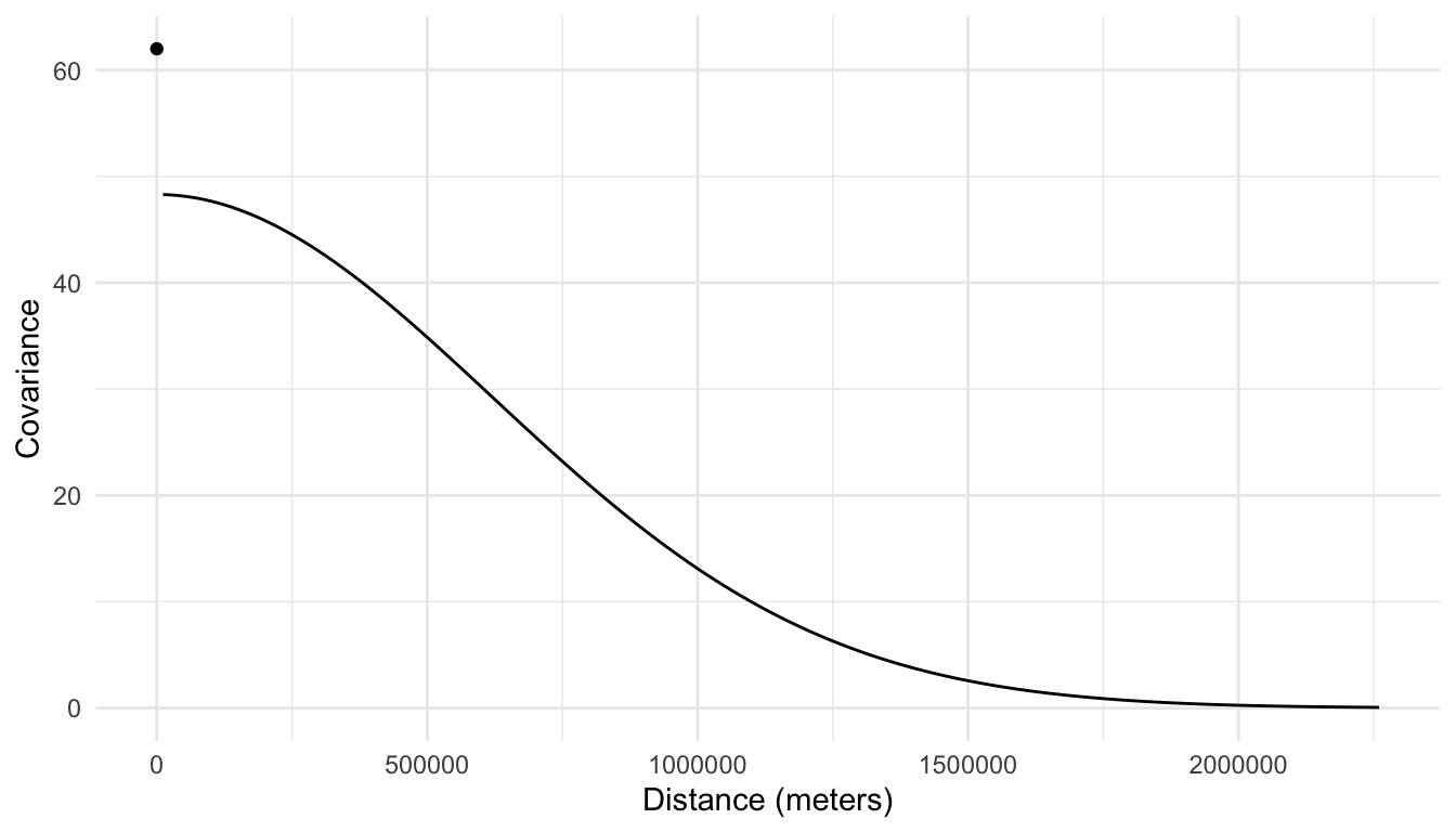 where \(Y_i\) is the random variable for sulfate concentration at location \(i\), \(Y_j\) is the random variable for sulfate concentration at location \(j\), and \(h_{ij}\) is the distance between locations \(i\) and \(j\). And, we can see from the following plot that there is a large amount of covariance between sulfate concentration at spatial locations that are close together.