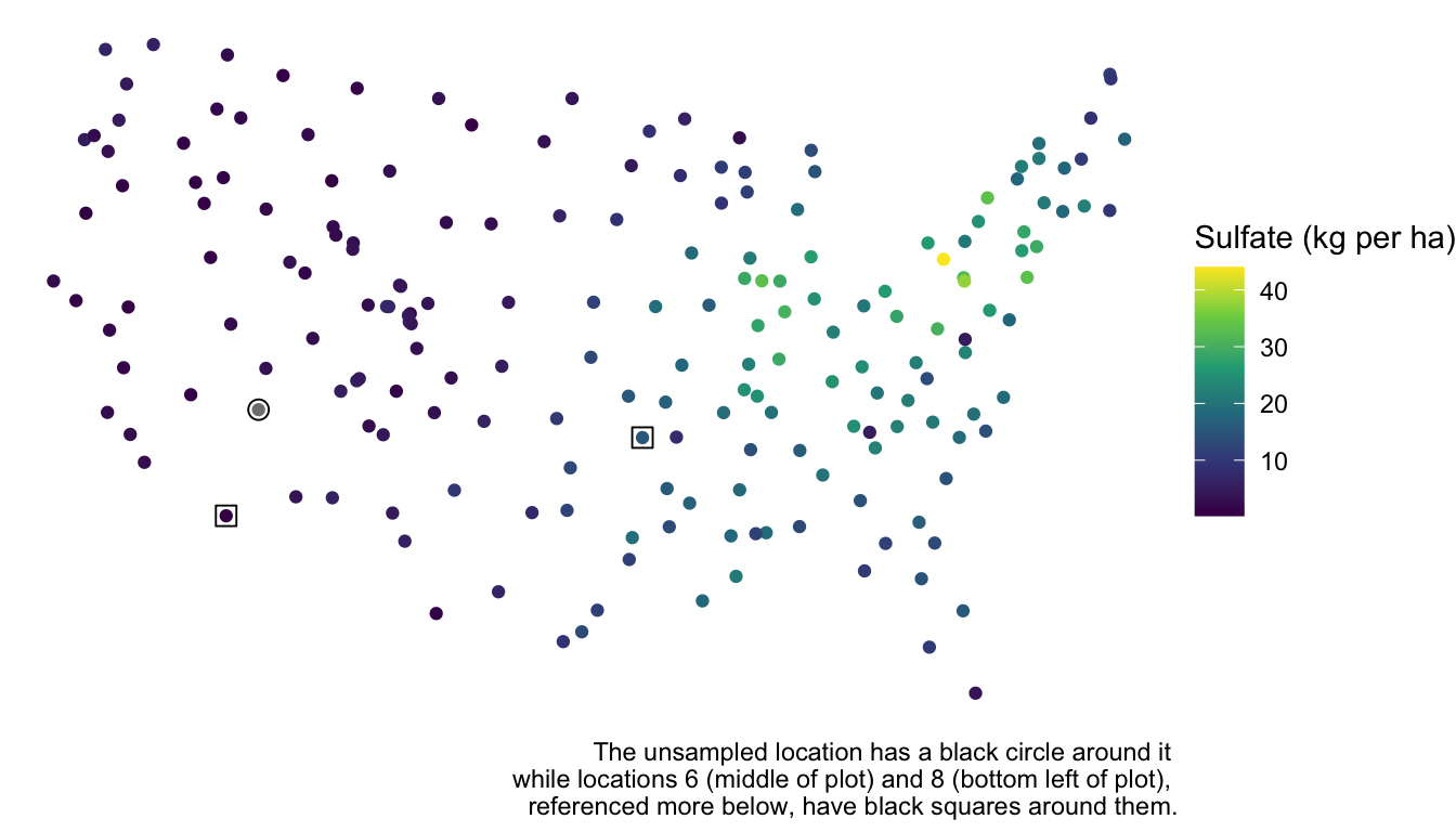 labs(caption = "The unsampled location has a black circle around it \n while locations 6 (middle of plot) and 8 (bottom left of plot), \n referenced more below, have black squares around them.")