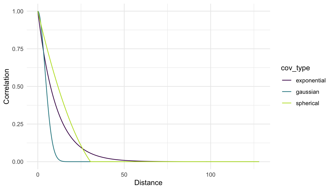 There are many functions to choose from to model spatial correlation. We saw the formula for the exponential correlation function in Equation 2.2. Some other common spatial correlation functions include: