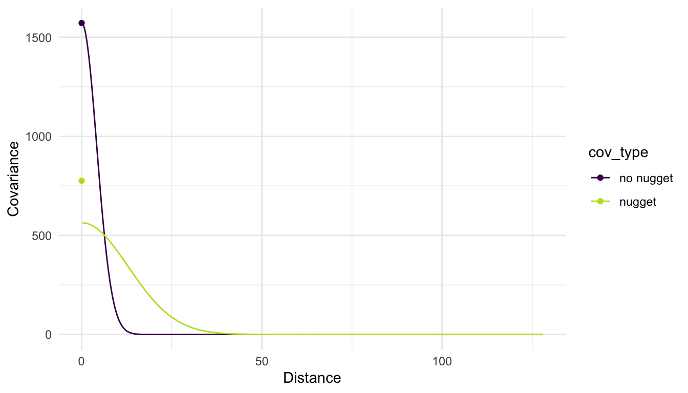 Though the covariance can be modeled using Equation 2.6, more commonly, we introduce a third covariance parameter to model spatial covariance. This third covariance parameter is often called the nugget and inflates the covariance only when the distance \(h\) is equal to 0. Including the nugget often helps with model fit, so, unless there is a good reason not to, most spatial models include a nugget parameter.