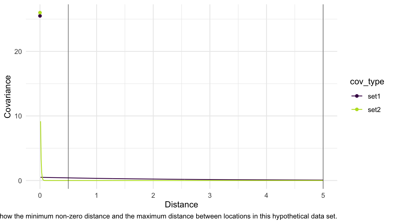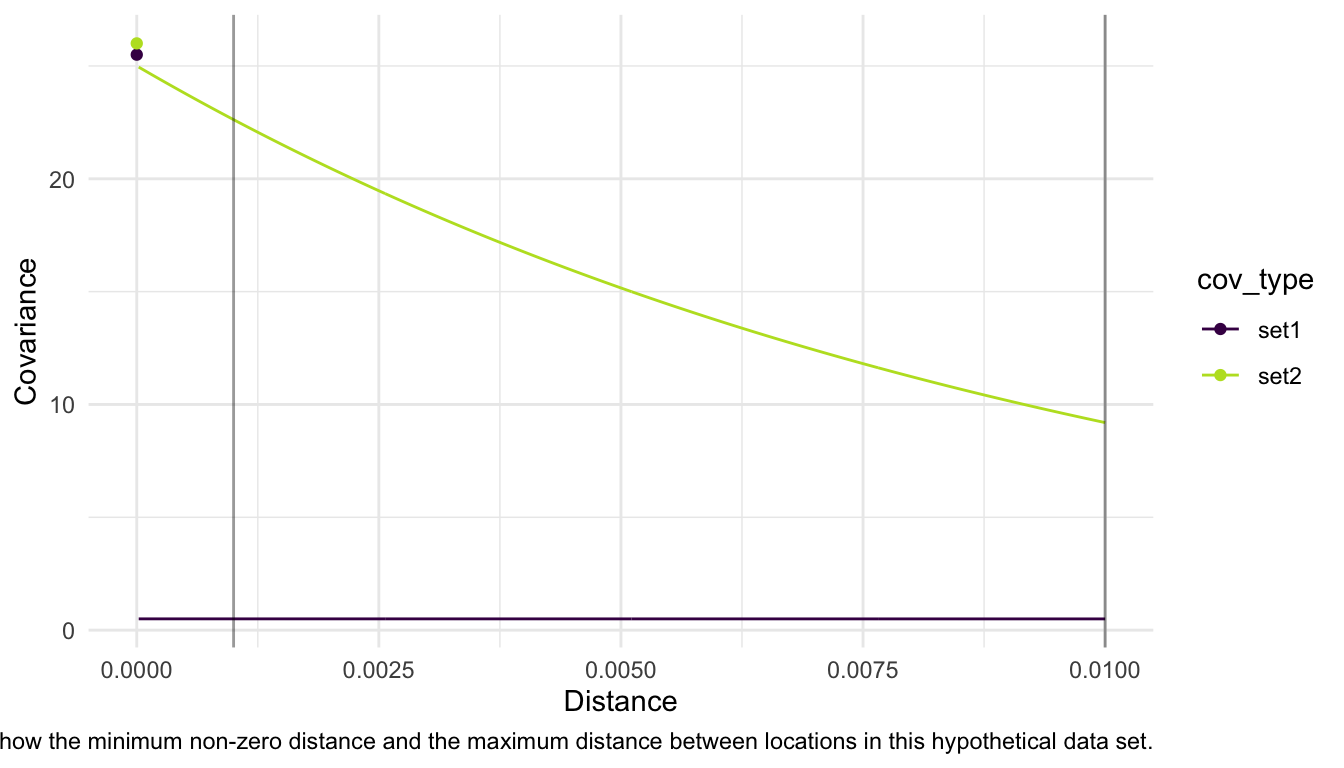 Note that, for the same exact example, if our observed data was actually observed in a space such that the minimum distance between two locations is 0.001 units and the maximum distance between two locations is 0.01 units, the two models above are now quite different!