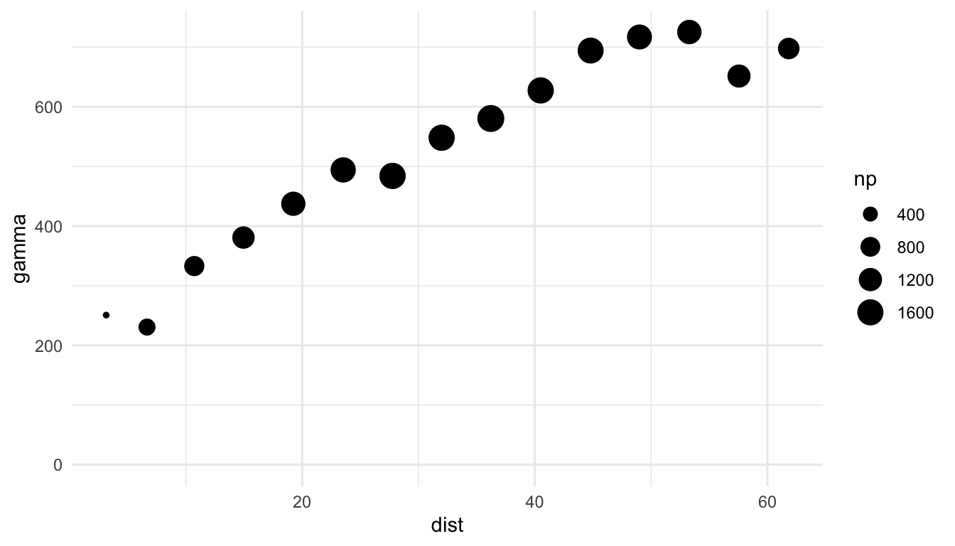 ggplot(data = baltimore_esv, aes(x = dist, y = gamma, size = np)) +