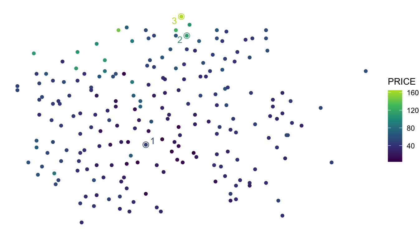 We can calculate the estimated correlation explicitly using the estimated range parameter and the exponential correlation formula in Equation 2.2. The estimated correlation for locations 1 and 2 is \(e^{-42.72 / 10.6} = 0.0178\) while the estimated correlation for locations 2 and 3 is \(e^{-7.28 / 10.6} = 0.503\). This tells us that, according to our model, the correlation between the random variables for price at locations 1 and 2 is negligible: knowing the realized house price at location 2 tells us very little about what the realized house price will be at location 1. On the other hand, the correlation between the random variables for price at locations 2 and 3 is moderately strong: knowing the realized house price at location 2 tells us that there is a strong possibility that the realized house price at location 3 is similar to the realized price at location 2.