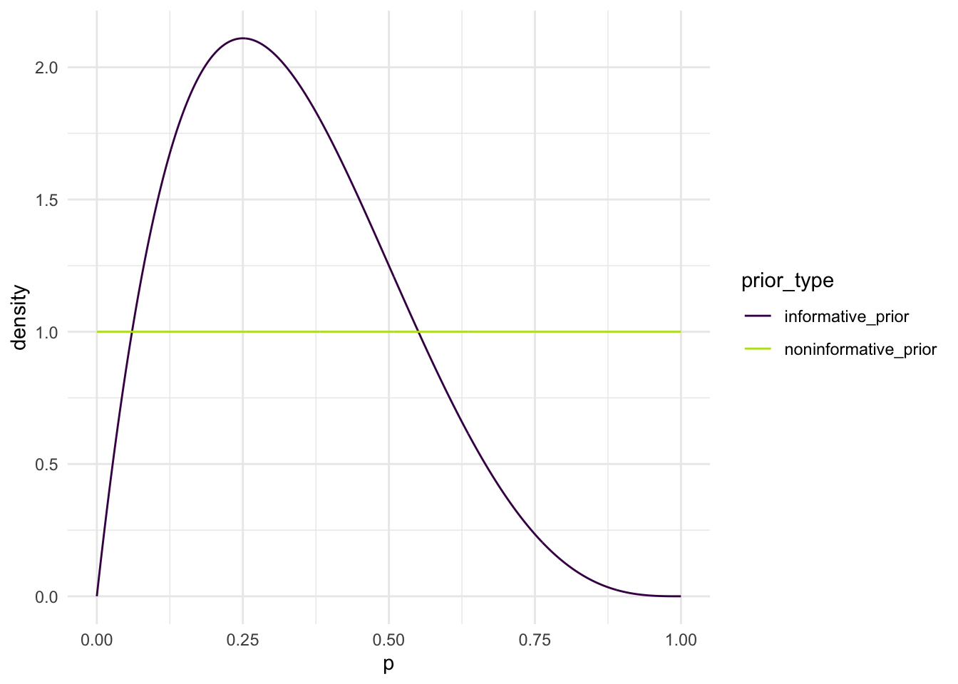 library(tidyverse)ps<-seq(0, 1, length.out =1000)informative_alpha<-2## CHANGE THIS TO YOUR ALPHAinformative_beta<-4## CHANGE THIS TO YOUR BETAnoninformative_alpha<-1noninformative_beta<-1informative_prior<-dbeta(ps, informative_alpha,informative_beta)noninformative_prior<-dbeta(ps,noninformative_alpha, noninformative_beta)prior_plot<-tibble(ps, informative_prior, noninformative_prior)|>pivot_longer(2:3, names_to ="prior_type", values_to ="density")ggplot(data =prior_plot, aes(x =ps, y =density, colour =prior_type))+geom_line()+scale_colour_viridis_d(end =0.9)+theme_minimal()+labs(x ="p")