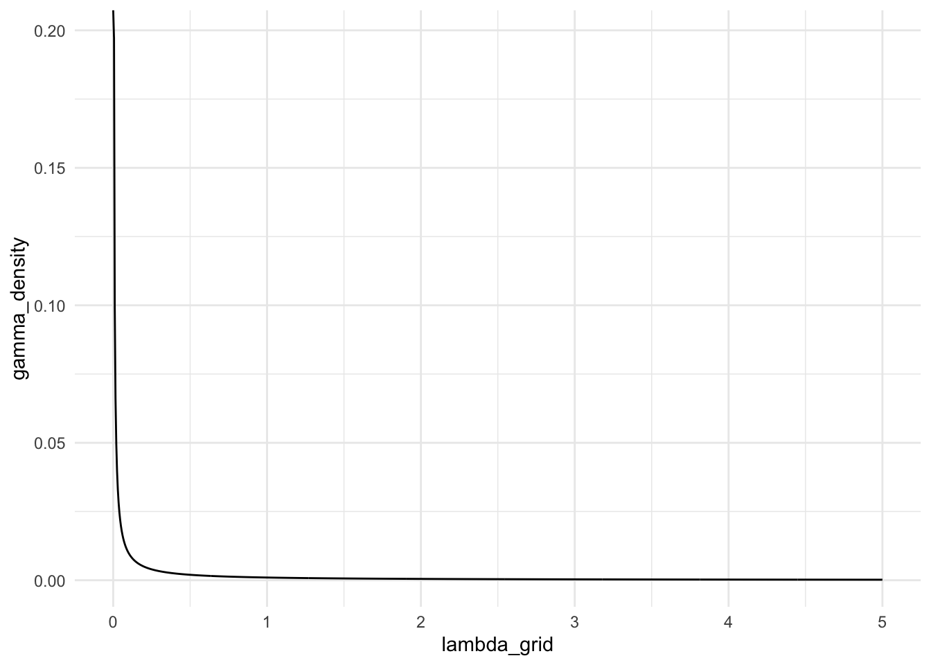 A relatively non-informative prior for \(\lambda\) is a Gamma distribution with very small values for both \(\alpha\) and \(k\). Note that, for the gamma distribution, I am replacing \(\lambda\) with \(k\), so that we are not working with two different \(\lambda\)’s (since the Poisson also has a parameter called \(\lambda\)). Using \(\alpha = 0.001\) and \(k = 0.001\), construct a plot of a relatively non-informative prior for \(\lambda\) using the code below.