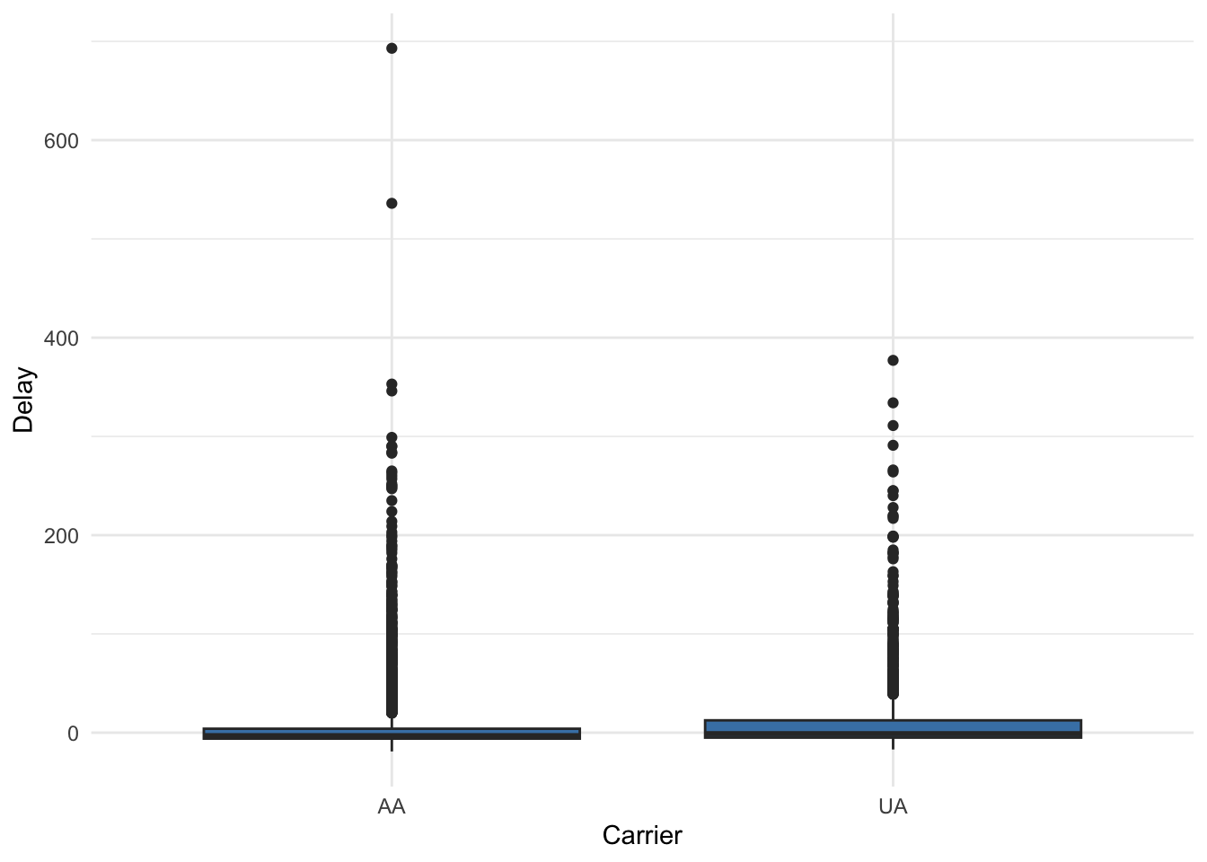 Consider again the flight delay data. Here, we will consider whether or not there is statistical evidence that the mean delay of United Airlines is different than the mean delay of American Airlines.