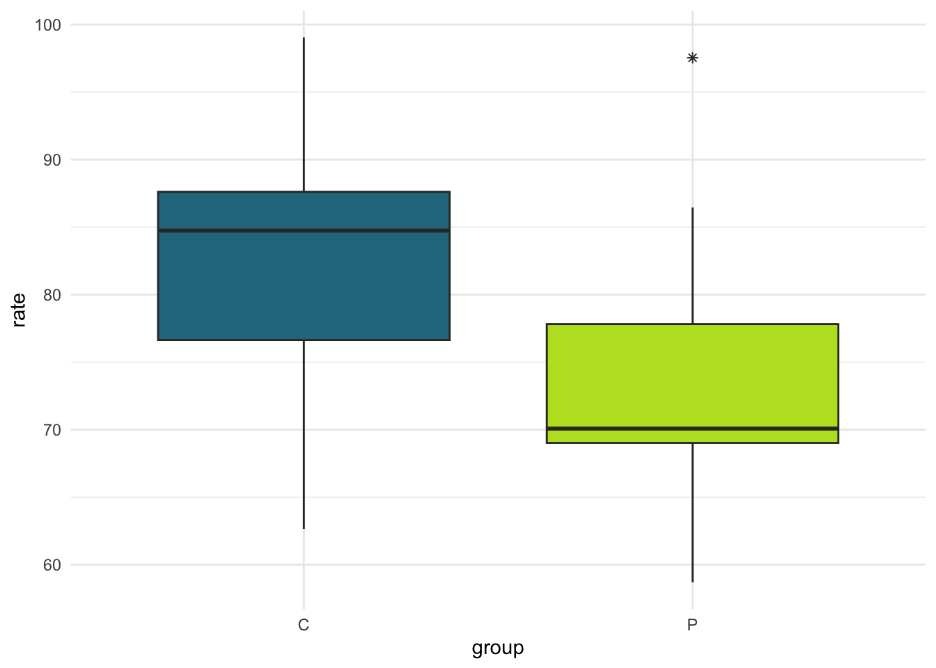 Many of you took our probability exams with the adorable Mipha providing moral support throughout the exam. There has actually been formal research assessing whether being in the presence of a dog can have beneficial effects for people. In one such study, researchers recruited 30 women who were self-proclaimed dog lovers. They randomly assigned 15 women to a stressful task alone (control: C) and 15 women to do a stressful task with a pet dog present (pet: P). The response variable is heart rate during the task, with higher heart rates presumed to mean that the there was more stress during the task.