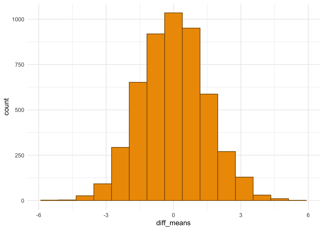 Rerun the code chunk above a few times to get a few different mean differences under different permutations. The big idea is that a large number of these mean differences will form the null distribution for the difference in sample means (if there really is no difference in the underlying population distributions).